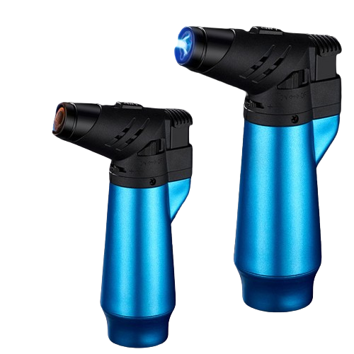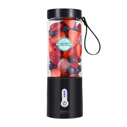 Blender portable bleu électrique et multifonctions avec des fruits à l'intérieur sur fond blanc